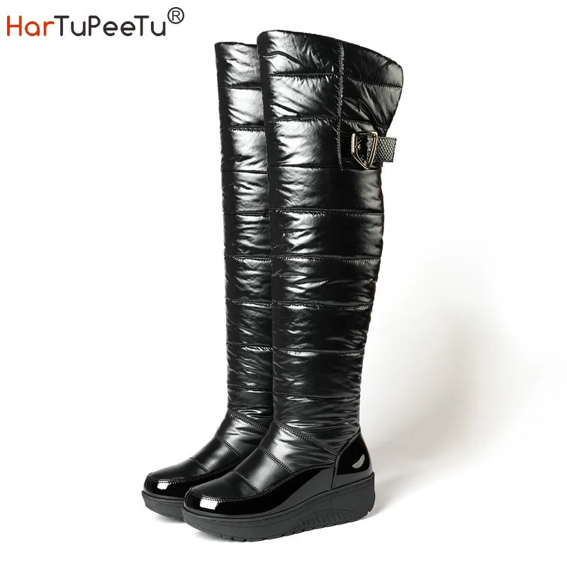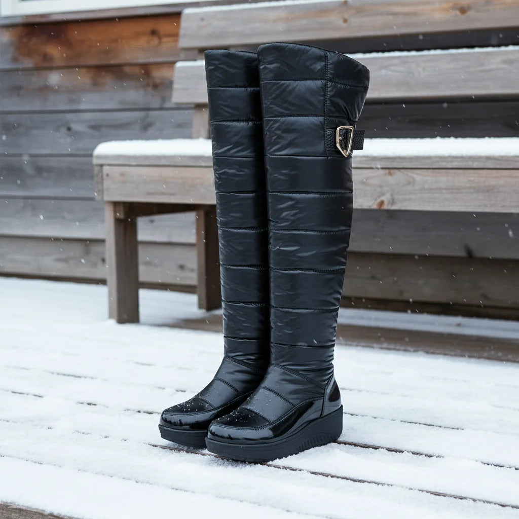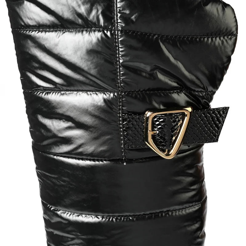 These boots are a true fashion statement! The sleek over-the-knee silhouette, elegant decorative buckle, and modern platform wedge combine to create a sophisticated look. They effortlessly elevate any winter outfit, proving you don't have to compromise style for warmth.